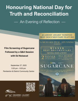 Join us an evening of reflection and learning at the Pemberton & District Community Centre. On September 27, a special screening of Sugarcane will take place to recognize National Day for Truth and Reconciliation. The award-winning documentary Sugarcane investigates the history of residential schools and highlights the resilience of Indigenous peoples.